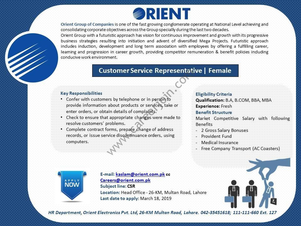 ORIENT Group Of Companies Jobs Customer Service Representative