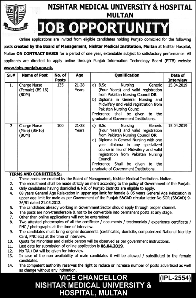 Jobs in Nishtar Medical University & Hospital Multan, Nurse Jobs in Nishtar Medical University & Hospital Multan, Charge Nurse Jobs in Nishtar Medical University & Hospital Multan